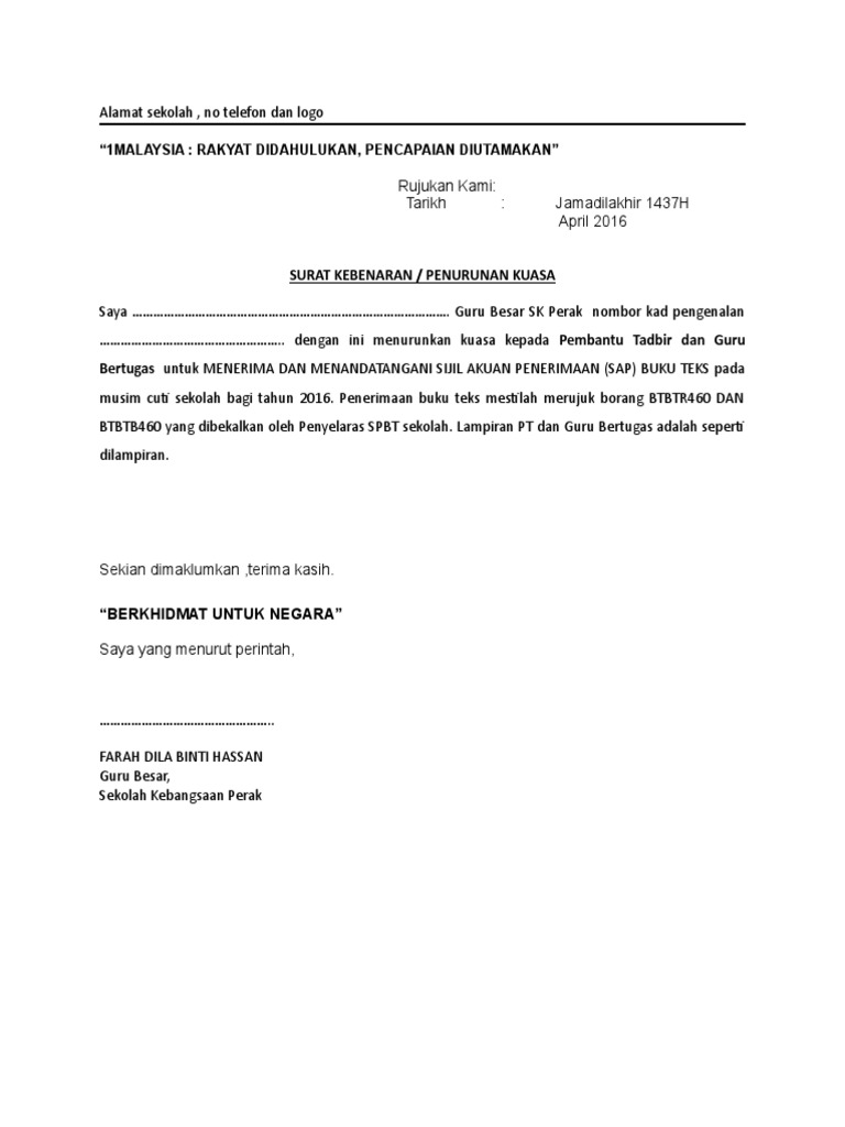 . Agensi hendaklah memastikan bahawa hanya pegawai awam yang telah diturunkan kuasa secara bertulis di bawah Seksyen 2 Akta Kontrak Kerajaan 1949 menandatangani dokumen perjanjian bagi pihak kerajaan. SURAT PENURUNAN KUASA AKAUN TERIMAAN. You have just read the article entitled Contoh Surat Penurunan Kuasa Penerimaan Buku Teks.